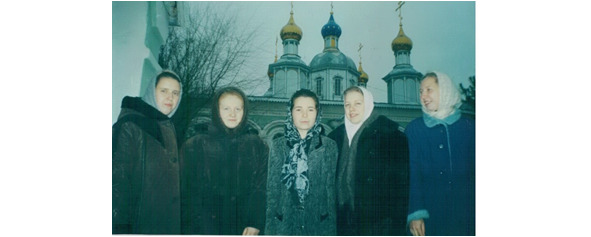 На фото: Сестра Люда А., сестра Ксюша З., Татьяна Михайловна Т, сестра Таня А. и Оля Т. На втором плане купола храма прав. Симеона Верхотурского, на месте которого сейчас стоит Троицкий собор.