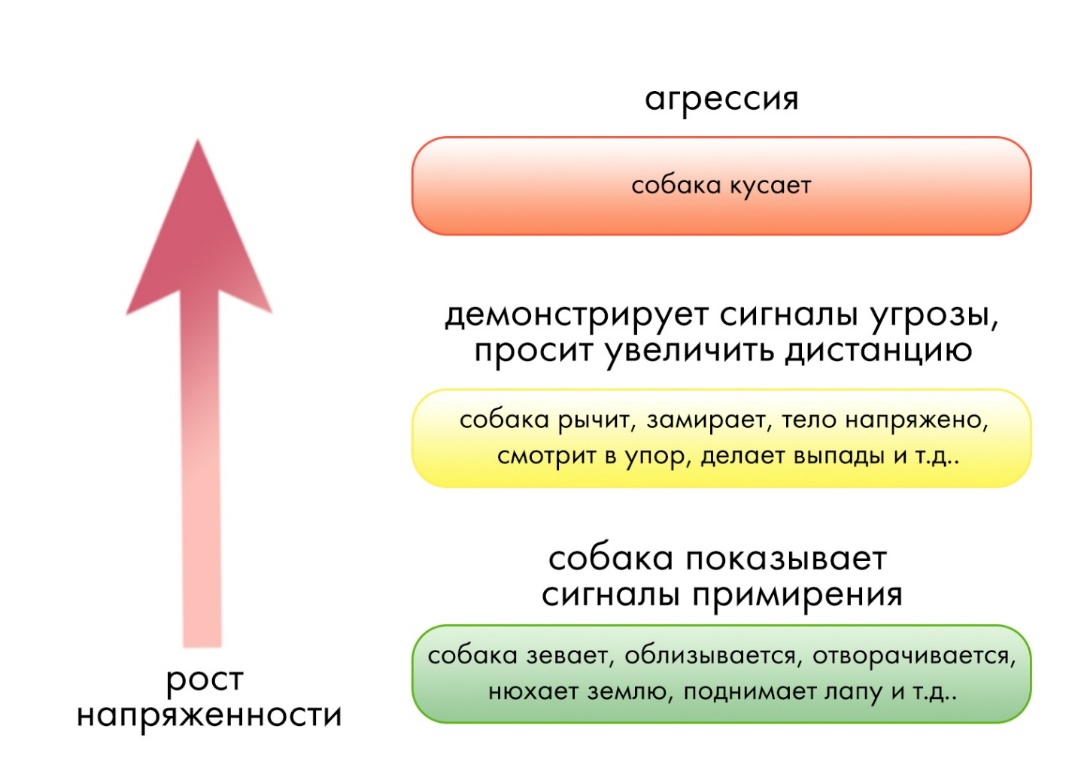 Почти всегда рычанию, оскалу и тем более укусам предшествует цепочка сигналов, которыми собака сообщает о своем напряжении. Это можно представить в виде лестницы с зелеными, оранжевыми и красными ступенями. В кинологии есть понятие коммуникативной шкалы или лестницы агрессии – по мере роста напряжения собаки меняются и сигналы, которыми она это показывает.
