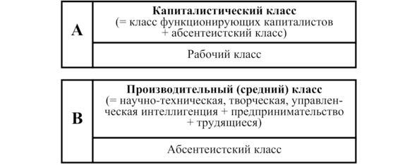 Разница по отношению к средствам производства и производимому продукту у этих групп людей достаточно разнородна, вследствие чего первых из них мы причислили к производительному классу, непосредственно участвующему в общественном производстве, а вторых – к абсентеистскому или отсутствующему в общественном производстве классу.