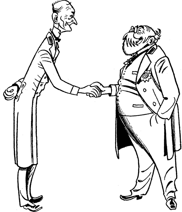 Маленький старичок в мундире с медалью пошел мне навстречу. Он показался мне серьезным и рассерженным, как все в этот день. Помня, что говорила мне мама, я щелкнул каблуками и низко поклонился, сняв за козырек фуражку.