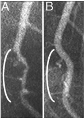 Рис. 0.2. Оба рентгеновских снимка показывают участок левой коронарной артерии, которая снабжает кровью большую часть сердца. Слева (A) можно увидеть больной сосуд (белая «трубка», которая выглядит как ветка и проходит сверху вниз, – обратите внимание на сужение в области белой скобки, как будто трубка сдавлена, что замедляет кровоток). На правой картинке (B) показан тот же самый сосуд после 32 месяцев строгой вегетарианской диеты, при которой пациент питался исключительно растительной пищей. Сужение исчезло, кровоток восстановился, артерия вновь выглядит совершенно здоровой. Болезни сосудов можно не только приостановить, но даже обратить вспять, и все это без хирургического вмешательства и медикаментозного лечения[11].