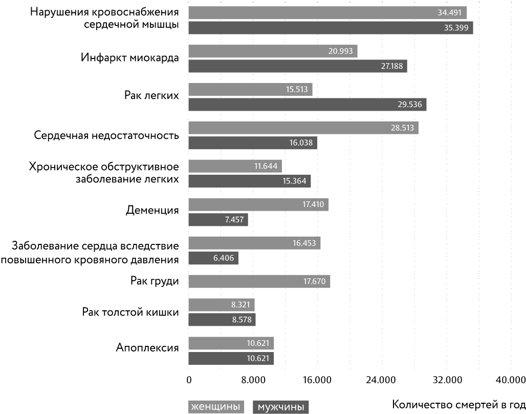Если взглянуть на список самых распространенных заболеваний, от которых в Германии умирает огромное количество людей (см. рис. 0.3), можно заметить, что все их объединяет общий знаменатель, который поначалу кажется настолько очевидным, что можно было бы не обращать на него никакого внимания. Молодые, как правило, могут похвастаться хорошим кровоснабжением сердца. Риск сердечного приступа или инсульта стремится к нулю. В детстве нам не нужно беспокоиться о повышенном кровяном давлении, не говоря уже о болезни Альцгеймера или какой-то другой форме деменции. Даже риск развития рака значительно возрастает уже с возрастом. То же самое относится к некоторым другим заболеваниям, в том числе: