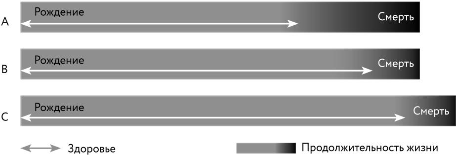 Рис. 0.4. С определенного возраста мы, как это часто бывает, начинаем бороться с различными недугами, которые в конце жизни могут доставлять настоящие мучения (сценарий A: здоровые годы показаны зеленым цветом; годы, когда недомогание усиливалось, – цветом от серого до черного). Даже если здоровое питание вряд ли способно продлить жизнь, оно все же остается решающим фактором, помогающим оставаться в форме как можно дольше. Фаза болезней отодвигается к концу жизни (сценарий В). Однако здоровое питание в состоянии сделать и то, и другое: продлить хорошее самочувствие и увеличить продолжительность жизни (сценарий С). Все это может показаться слишком оптимистичным, но результаты многочисленных экспериментов на животных и людях, относящихся к народам, чьи представители всегда отличались особенно высокой продолжительностью жизни, свидетельствуют в пользу того, что сценарий C вполне реалистичен.