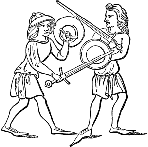 Рис. 11. Меч и ручной щит. XIV век. Из рукописи в Королевской библиотеке Мюнхена