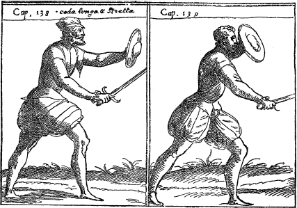 «Желаю, чтобы твой ученик упражнялся в них (ударах и защитах в виде контратак) четыре или пять дней вместе с тобой. Как только он хорошо их усвоит, начинай проверять его в каждой стойке, но особенно в стойках porta di ferro larga, stretta, или alta, a также в coda lunga e stretta. Тебе следует делать это в поединке с мечом и тарчем, щитом или баклером или с одним мечом. Пусть это покажет тебе, что, обучая школяра фехтовать любым из этих видов оружия, ты должен добиться от него, чтобы он постиг все эти стойки одну за другой, шаг за шагом, вместе с их атаками и отбивами и все их недостатки и достоинства. Из этого трактата и его рисунков ты узнаешь – и потому не сомневайся и учи тому же, – что я не делаю различий между стойками для разного оружия. Но чтобы не рассуждать слишком пространно и избежать повторений, я объясню их только в связи с одним мечом или с мечом и баклером.