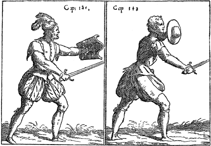Находясь в стойке, тарч или баклер держали в одном из двух положений: либо в вытянутой руке прямо перед собой, либо у груди или лица, согнув локоть под прямым углом. Удары парировали под тупым углом, чтобы клинок соскальзывал наружу, направо или налево, уколы отбивали плашмя в сторону.
