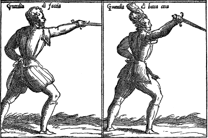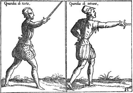 Смысл стоек не только Мароццо, но и всех остальных авторов до XVII века невозможно понять, если не вспомнить, что стойка была всего лишь первым этапом определенной последовательности botta[53], причем ни в коей мере не предполагалось, что она нужна для прикрытия какой-либо части тела. Позиции, которые по каким-то совершенно непостижимым причинам считались удачными, имели странные названия, очень похожие на жаргон и придуманные либо самим Мароццо, либо его учителем Антонио де Лукой, тоже уроженцем Болоньи, «из чьей школы вышло больше воинов, чем из троянского коня». Однако он говорит о них так, будто они всем отлично известны и не требуют пояснений.