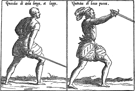 В этой стойке нужно быть patiente, ибо немногие атаки можно совершить из нее… Пусть твой ученик начнет с roverso, а после удара шагнет вперед правой ногой, одновременно отведет руку назад и выпрямит ее кистью к земле; тогда ты ему скажешь, что он занял стойку
