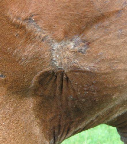 Напоминание о спортивном прошлом. Это осталось с троеборных времен, когда Рыжуль не слишком удачно зашел на препятствие. А, как известно, в троеборье ломаются не барьеры, а лошади. Вот он и загнал кусок себе в плечо. Зашили не слишком удачно, как видите.