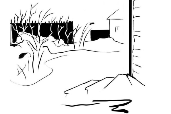 Забор, деревья, куст, стена.
