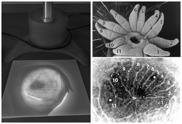 2.4. Карта звезды на ткани головного мозга, спроецированная с предметного стекла на лист бумаги (слева) и увеличенная для лучшей детализации (справа внизу). На каждую сторону неокортекса проецируется половина звезды (справа сверху), то есть на каждом полушарии видно одиннадцать сегментов (справа снизу). Обратите внимание: одиннадцатый сегмент намного больше остальных