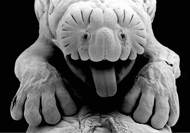 2.6. Жутковатый эмбрион звездоноса под электронным микроскопом. Формирующаяся звезда с двумя ноздрями похожа на голову инопланетянина, тогда как на самом деле голова и глаза крота расположены дальше, в глубине изображения. Обратите внимание на огромные формирующиеся передние лапы, которыми взрослые звездоносы роют тоннели