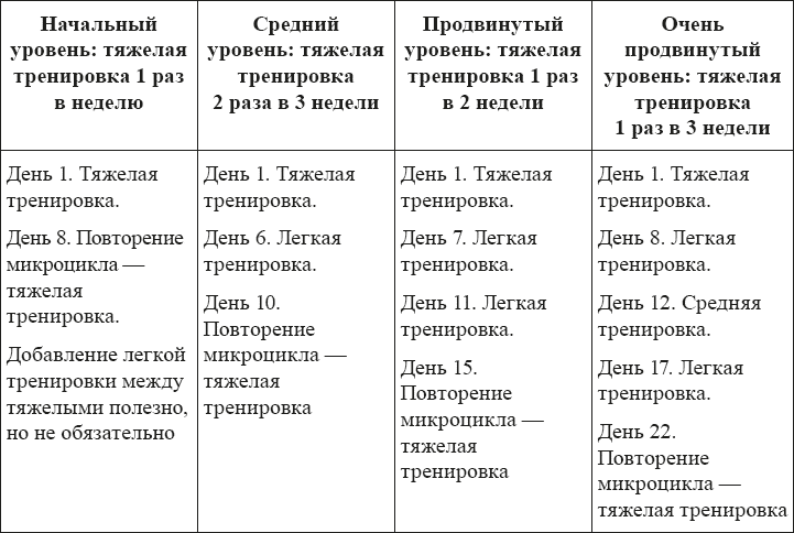 Для наглядности в таблице ниже представлены микроциклы для людей с разным уровнем тренированности. Микроцикл относится к конкретной группе мышц. У разных групп мышц тяжелые тренировки могут быть в разные дни.
