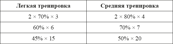 Диапазон тяжести легких тренировок простирается от совсем легких (это ноль разрушений и некоторое количество стимулирования роста) до средних тренировок (это немного разрушений и существенное стимулирование). Здесь и далее в книге будет использоваться следующая схема: подходы × вес × повторения. Если количество подходов не указано, оно по умолчанию равно одному.