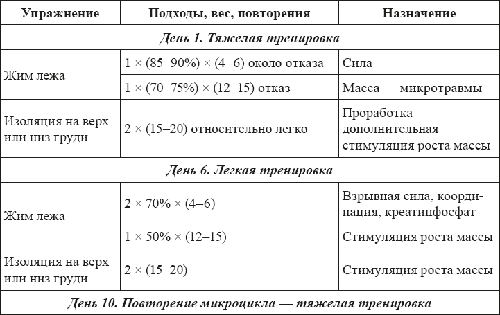 Распишем микроцикл (две легкие тренировки на приоритетные мышцы – грудь, дельты, бицепс, широчайшие – и одна легкая тренировка на прочие группы мышц).