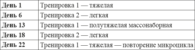 Тренировки группы мышц раз в 5 дней (4 раза за 3 недели)Несколько более продвинутым вариантом будет тренировать группу мышц четыре раза за микроцикл. В этом случае тренировку в середине микроцикла целесообразно сделать достаточно тяжелой, но все-таки умеренной и с массонаборным акцентом. Помним – нервы и конструкция серьезно работают один раз.