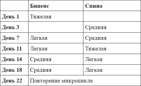 Сочетание пересекающихся мышц при таком подходе несколько усложняется. Тяжелая часть микроцикла одной мышцы накладывается на легкую часть микроцикла другой мышцы. Как вариант, вот так: