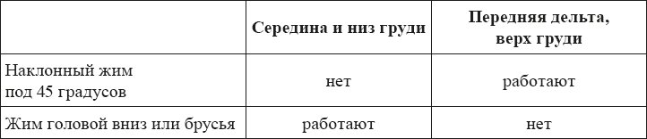 Толкающие мышцы – Грудь, дельтыА вот и решение – наклонный жим лежа под 45–50 градусов прицельно закрывает переднюю дельту и верх груди. Данное упражнение практически не пересекается с жимом вниз головой либо брусьями, так как даже середина груди, не говоря уж про низ, в этом упражнении не работает. Для наглядности приведу «разделение труда» между жимами в таблице.
