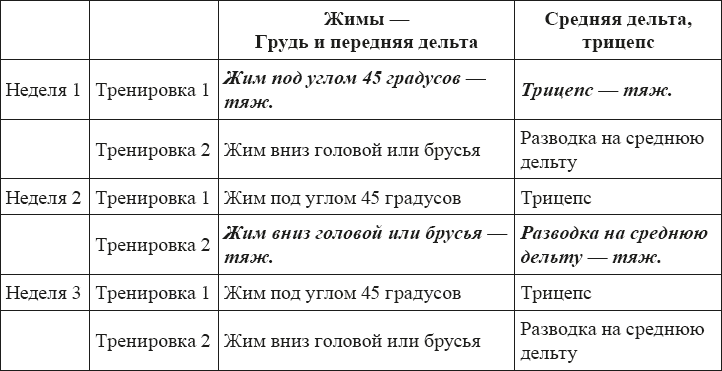 Особенно хорошо принцип разделения верха и низа груди сочетается с трехнедельным микроциклом. Получается, что тяжелые жимы на верх и низ груди разделены на 10 дней. Микроцикл для толкающих мышц – груди, дельты и трицепса приведен ниже, тяжелые тренировки выделены: