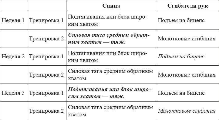 Здесь проблема не столько в самой спине, сколько в совмещении тренировок спины с тренировками сгибаний рук. Главной ошибкой при моих первых попытках разделять тяжелые тренировки середины и верха спины была попытка при этом еще и тяжело качать руки. Впоследствии стало очевидно, что две выделенные тренировки спины за микроцикл сами по себе дают большую нагрузку на бицепсы, а также на плечевую с лучевой. Поэтому все попытки дополнительно серьезно качать руки были неудачными. Сконцентрируйтесь на спине. Рукам – только средняя прокачка. Ну, может быть, раз за трехнедельный микроцикл можно сделать полутяжелую массонаборную тренировку. Комплекс приобретает вот такой вид. Тяжелые тренировки выделены.
