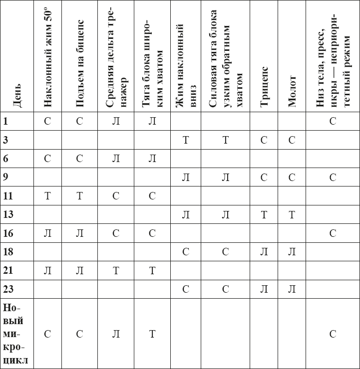Комплекс получается очень сложный и довольно объемный. Минимально у меня получилось грамотно расставить 10 тренировок за 24–25 дней, при этом избежав явных пересечений тяжелых тренировок взаимозависимых групп мышц. Трудно удержать в памяти, что и когда делать. С учетом дополнительных беговых тренировок, для меня это слишком много. Впрочем, для молодых и мотивированных, думаю, это будет самый «крутой» вариант, который я могу предложить. В таблице ниже Л, С и Т – это соответственно легкие, средние и тяжелые тренировки.