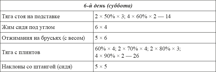 Чтобы не быть голословным, приведу пример одной тренировочной недели по плану Шейко (подходы × вес × повторения, если количество подходов не указано – оно по умолчанию равно одному). Эти нагрузки предлагается назначать атлетам уровня КМС-МС.