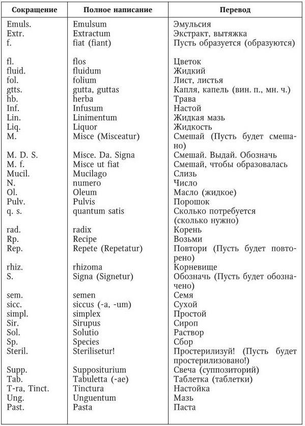 При выписывании рецептов в них допускаются сокращения (табл. 1). Они касаются как лекарственных веществ, так и лекарственных форм, а также действия фармацевта (возьми, смешай, дай таких доз, обозначь и др.). Сокращения должны быть общепринятыми, однозначно понятными и не вызывать у фармацевта сомнений. Иначе больной в лучшем случае не получит вовремя нужное ему лекарство.