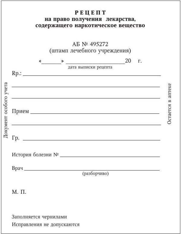 Для выписывания рецептов на наркотические средства предусмотрены специальные бланки с водяными знаками и серийным номером.
