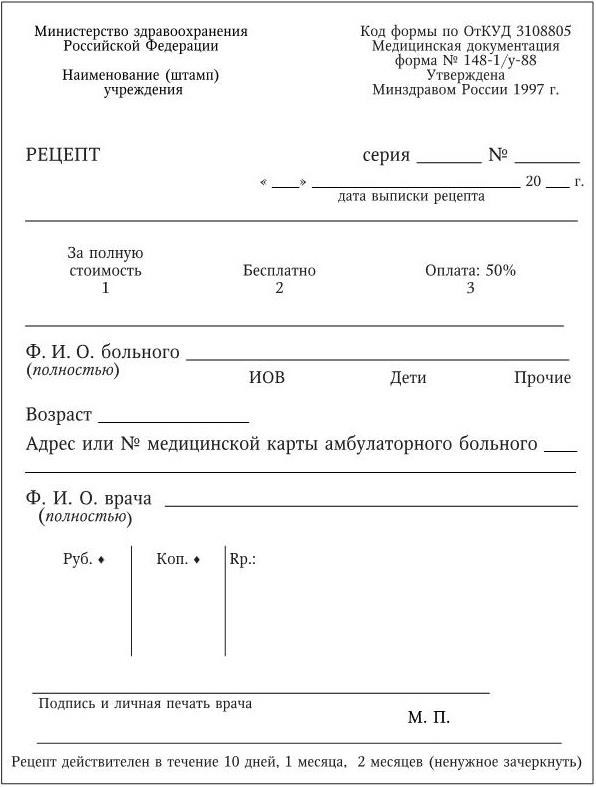 Такие рецепты дополнительно к подписи и личной печати врача заверяются печатью лечебно-профилактического учреждения «Для рецептов». Если лекарство отпускается на льготных условиях, рецепт оформляетсявдвух экземплярах.