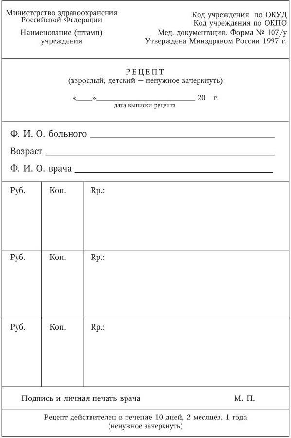 Они также должны иметь штамп лечебного учреждения; рецепты заверяются подписью и личной печатью врача (фельдшера).