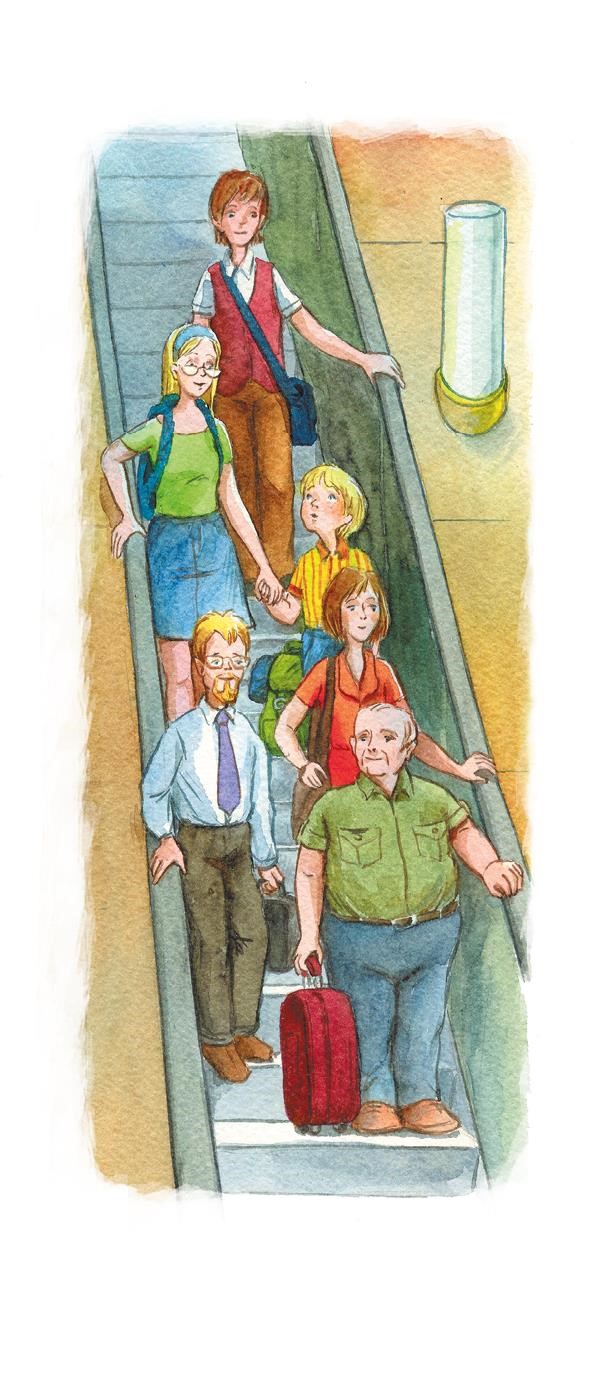 Вокзал был совсем новый. В прежние времена никому и в голову бы не пришло, что, вместо того чтобы идти на своих двоих, можно прокатиться на такой дорожке. Пассажирам с тяжёлыми чемоданами это очень удобно – поставил багаж рядом с собой и кати себе вперёд!