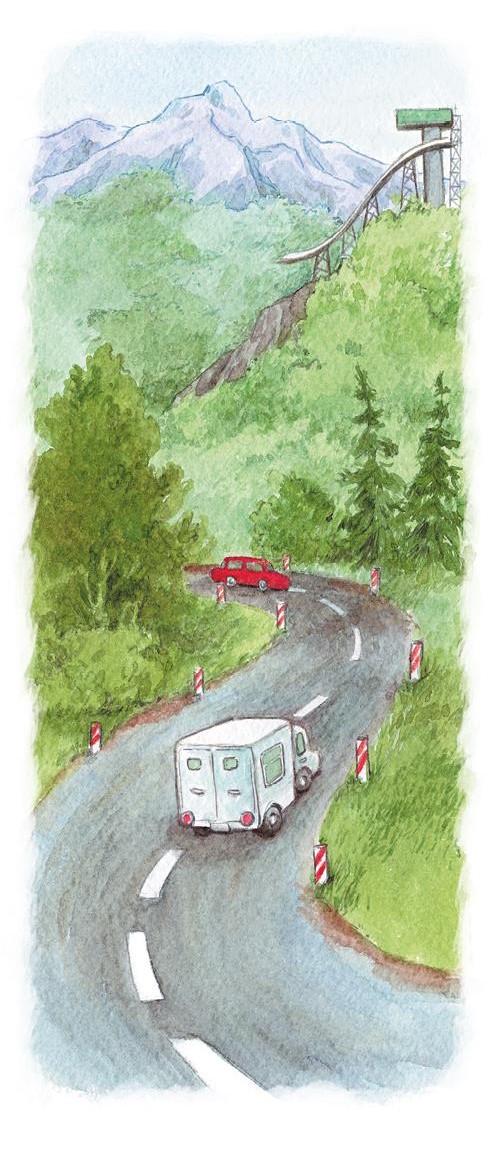 Они ехали по городу, дорога шла всё время вверх. Каос не очень-то смотрел по сторонам, они с Бьёрнаром скатали бумажный мячик и стали им перебрасываться. Но он всё-таки заметил, что город кончился. Теперь вдоль дороги стоял высокий лес. А над деревьями, почти подпирая небо, возвышался большой лыжный трамплин.