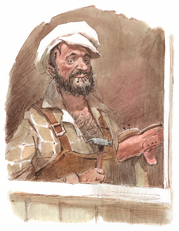 Малыш опасливо заглянул в окно дома башмачника. Хозяин оказался дядькой с чёрной бородой, в расстёгнутой на волосатой груди рубахе. Во рту он держал мелкие гвоздики.