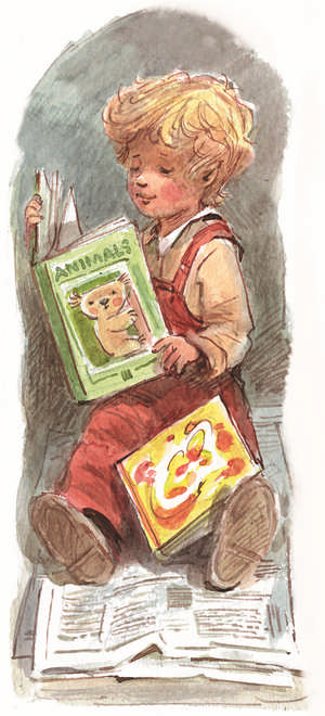 И сам магазин был книжный. С книгами здесь можно знакомиться, говорил папа, брать их в руки, рыться на полках и в коробках. Малыш зашёл в магазин и страшно смутился. Он не ожидал, что книг здесь так много. Они лежали на всех прилавках и столах, и все полки от пола до потолка были сплошь заставлены книгами. Малыш даже вздохнул: непонятно, с чего тут начать.