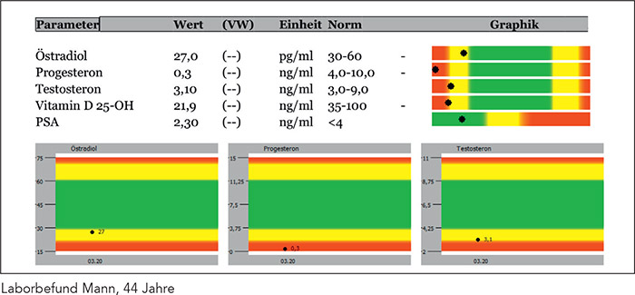 Auch für Männer ist Progesteron das wichtigste Vorläuferhormon, insbesondere für Testosteron. Männer über 40 haben oft einen zu geringen Progesteronspiegel. Dieser ist häufig bereits erniedrigt, wenn das Testosteron noch knapp in der Norm ist. Während Frauen deutliche Symptome bei Progesteronmangel verspüren, sind diese bei Männern nicht so stark oder kaum merklich ausgeprägt. Spätestens aber wenn Testosteron abfällt, merken die Männer dies. Der folgende Befund zeigt die typische Hormonsituation eines Mannes von Anfang 40. Wir sehen einen niedrigen Testosteron- und kaum nachweisbare Progesteronwerte. Durch Dauerstress und somit ständig erhöhte Cortisolspiegel ist das Progesteron und in Folge das Testosteron (und auch das Östradiol) gesunken. Wir kommen auf diese Zusammenhänge später noch einmal zu sprechen.