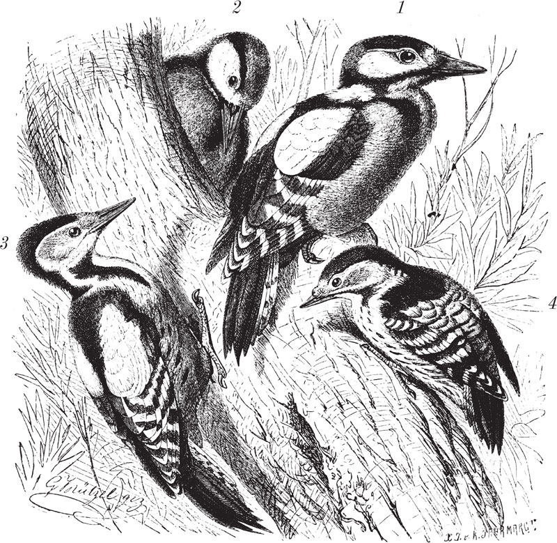 Пестрые дятлы: 1 – большой, взрослый; 2 – большой, молодой; 3 – средний; 4 – малый