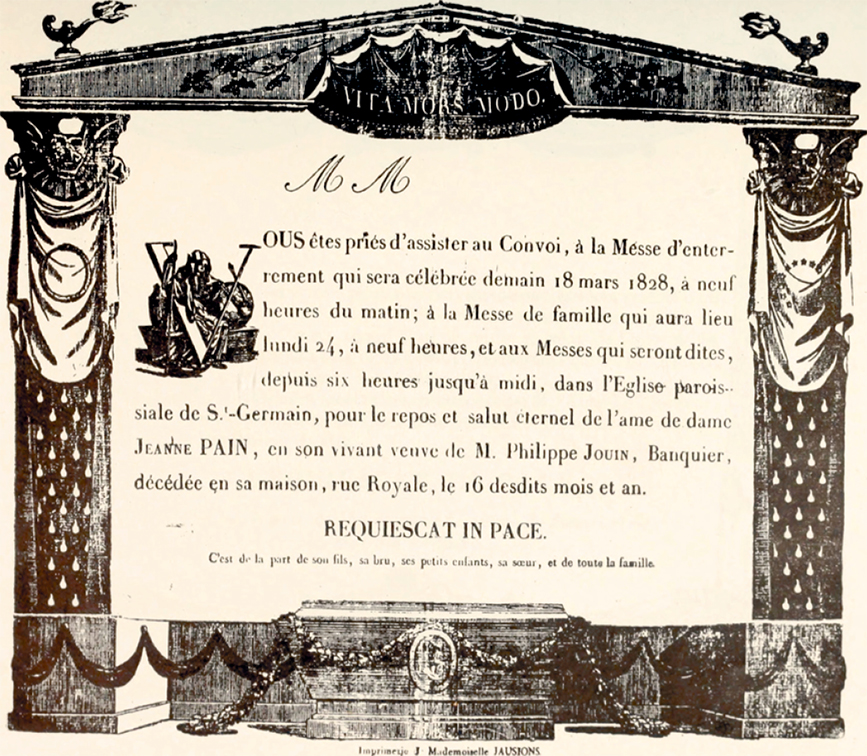 Погребальная афиша 1843 года, извещающая о дате, времени и месте похорон Жанн Пэн. Автор: Esquieu, Louis, 1865. Public domain.