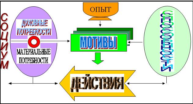 На схеме всё изображено блоками. Блок потребностей; блок мотивов; блок способностей; блок действий и блок опыта. Вот эти блоки и рассмотрим сначала по-отдельности, а потом все вместе, чтобы сделать вывод о сознательной деятельности личности. Но, я думаю, что уже при рассмотрении отдельных блоков схемы всё станет понятным.
