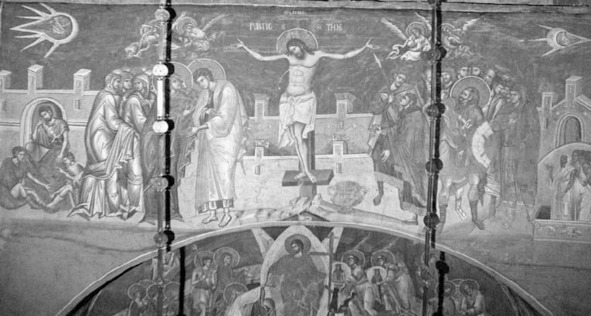 На фреске «Распятие» большая группа людей и ангелы, порхающие в небе. Ангелы закрыли уши руками и в ужасе, будто ослепленные и оглушенные, отшатнулись от необычного для них видения. На лицах людей недоумение, растерянность. Стадное чувство страха согнало их в плотные группы. Они сгрудились вокруг вооруженных воинов, надеясь на защиту. Но и воины выглядят небоеспособными, оторопевшими.