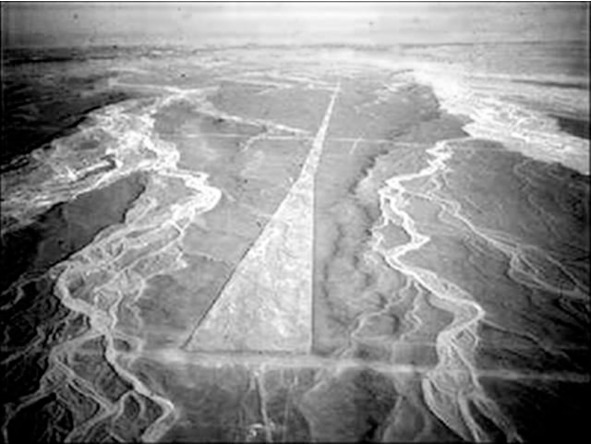 От «трезубца» в глубь страны тянется прямая белая, хорошо видимая только с воздуха линия. Она идет через горы и долы и заканчивается на подходе к горному плато Наска.