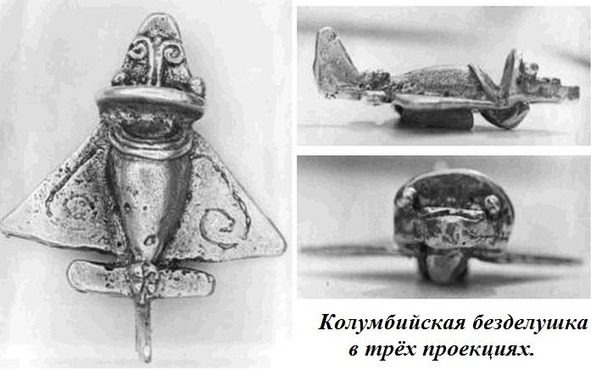 В Колумбийском национальном банке хранится золотая крылатая безделушка. Ей около или более тысячи лет. Думали, что это рыбка или насекомое, изваянное в металле. Но геолог Андерсен догадался отдать древнюю вещицу на экспертизу авиастроителям, и те, продув золотую модель в аэродинамической трубе, зафиксировали: «…летные качества модели превосходные. Настоящий аппарат, построенный по данным продувки, мог бы летать с большой скоростью, быть маневренным и простым в управлении».