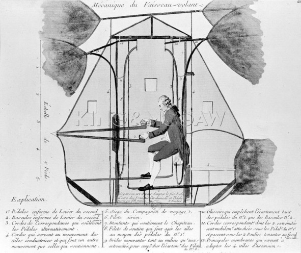 Такая машина действительно была построена девятнадцатилетним изобретателем. Легкие машущие крылья, напоминающие парашют, прикрепленные к деревянной раме, приводились в движение руками и ногами человека. Испытывая аппарат, привязанный к веревке, перекинутой через блок, Бланшар поднимался на высоту двадцать три метра, имея противовес всего около десять килограммов. А это значит, что до свободного полета его крыльям не хватало всего десяти килограммов вертикальной тяги!