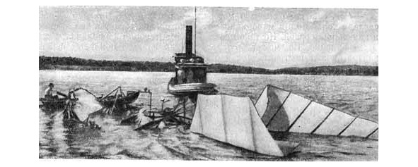 «…14 сентября 1903 года (дата искажена. – В. К.) в заливе Уайд-Уотера, на реке Потомак, на границе штатов Мэриленда и Виргинии, был произведен интересный опыт с изобретением Ланглея (фамилия искажена. – В. К.) «Гигантский кузнечик, форму которого имел прибор американского ученого, был выпущен с палубы высокого судна (читай – низкого дебаркадера. – В. К.), стоявшего в реке близ берега и специально устроенного для этой цели… Прибор… тяжело рухнул на землю (читай – на воду. – В. К.) и вдребезги разбился… Таким образом, и этот опыт, для которого не жалели никаких средств (прибор Ланглея со всеми приспособлениями обошелся более 350 000 долларов, или 700 000 рублей (опять искажение. – В. К.), не увенчался успехом… Погибли труды многих лет, погибла идея…»