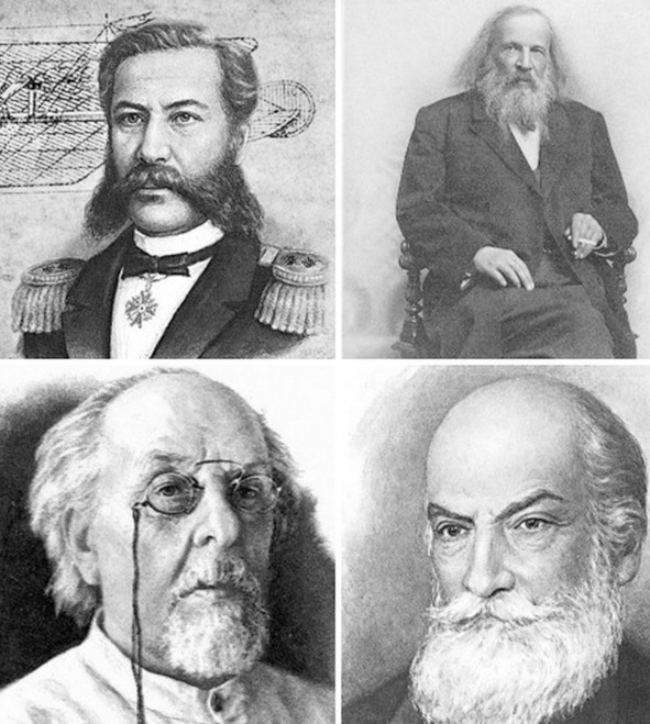 ( сверху-вниз, слева-направо)1. Можайский Александр Федорович— русский военный деятель, контр-адмирал,изобретатель, пионер авиации.2. Менделеев Дмитрий Иванович-русский ученый.3. Циолковский Константин Эдуардович-русский ученый, отец космонавтики.4. Жуковский Николай Егорович- русский механик, создатель аэродинамики , как науки.