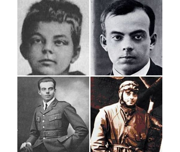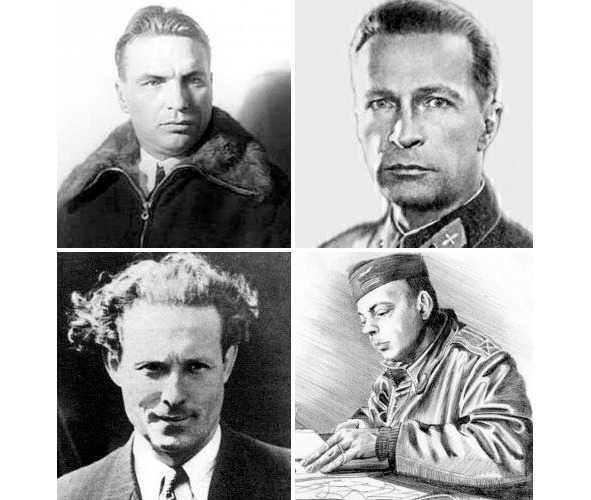 (сверху вниз и слева направо) Русский лётчик Валерий Чкалов, русский лётчик Михаил Громов, французский лётчик Жан Мермоз, французский лётчик Антуан де Сент-Экзюпери