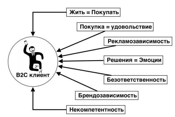 Я думаю, у каждого бывало (если не у вас лично, то у знакомых), что приобретение дорогих вещей в кредит противоречит логике и экономическим возможностям. Большинство потребителей строит свой бюджет крайне эмоционально, основываясь на сиюминутных желаниях, порожденных рекламой или социальным влиянием. В этом смысле решения С-клиента в подавляющем большинстве случаев не самостоятельны. Совершать покупки вынуждают мода, реклама, мнения друзей и знакомых, иные методы социального давления. Ситуация на рынке B2C часто характеризуется высоким уровнем безответственности со стороны C-клиента. Принимая решение, потребитель несет ответственность только перед самим собой. А психологи недаром утверждают, что степень ответственности без внешнего контроля очень низка. Усилиями маркетологов человек на рынке превращается в ребенка.
