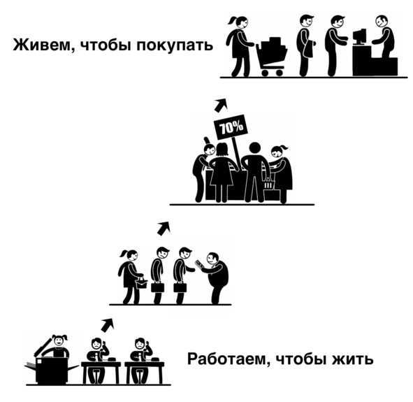 Если разобраться, какова цель нашей работы? Мы зарабатываем деньги, чтобы покупать, получая удовольствие. Человек в обществе потребления живет, чтобы пприбретать. И зарабатывает он для этого же.