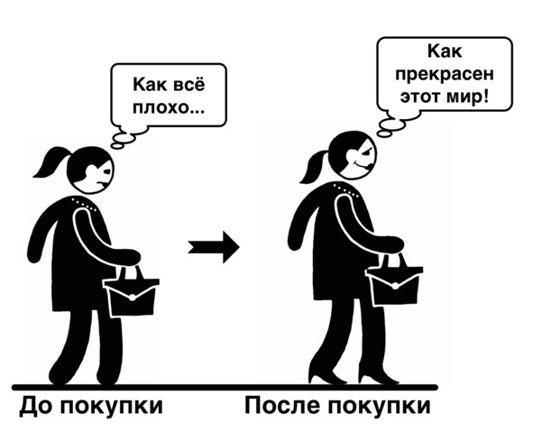 Реклама не только побуждает человека покупать, но и придает шоппингу смысл и цели. Что вы делаете, когда у вас плохое настроение? Многие наверняка ответят: «Иду в магазин и что-нибудь себе покупаю». Шоппинг для частного лица давно превратился из обеспечения себя или своей семьи предметами необходимости в нечто иное: вид психотерапии, развлечение, подтверждение социального статуса и т. п.
