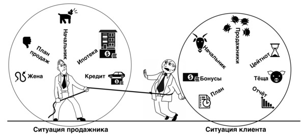 Прежде чем разбираться, как ситуация влияет на поведение клиентов, посмотрим, что она из себя представляет и из чего состоит. На первый взгляд ситуация продаж и переговоров такова: два человека общаются, чтобы достичь целей, каждый своих.