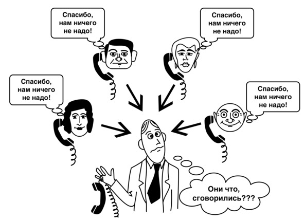 Но все они отвечают на ваш холодный звонок ОДИНАКОВО. Почему? Куда девается индивидуальность? Мало кто может внятно ответить. И я понимаю, почему. Специалистов по продажам не учат думать в эту сторону.